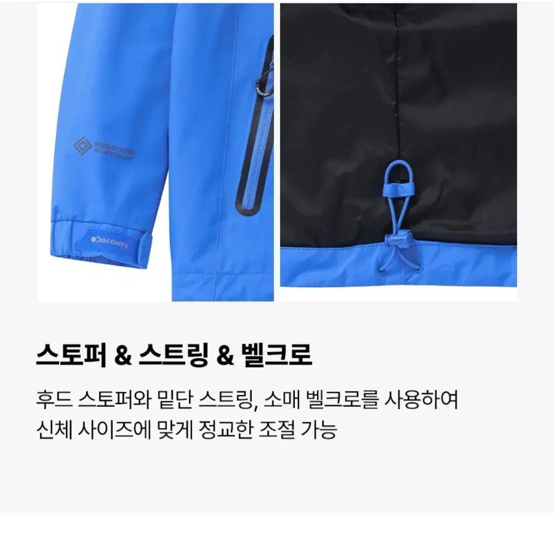 -フードストッパー、裾ストリング、スリーブベルクロでサイズ調節可能