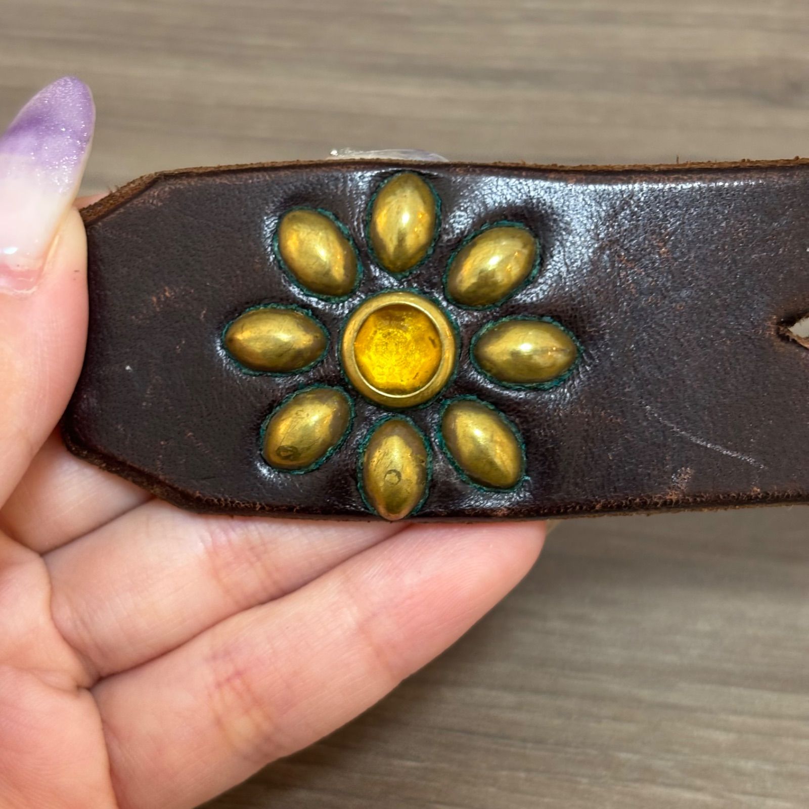 ガラスストーンがあしらわれたカウレザー製で、ヴィンテージ加工が施されています。