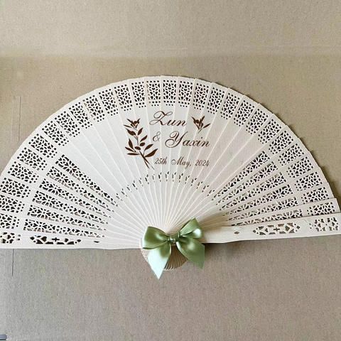 30 個ロットカスタム木製折りたたみ扇子、パーソナライズされた結婚式の記念品、レーザー彫刻ロゴテキスト、安い洗礼パーティーギフト