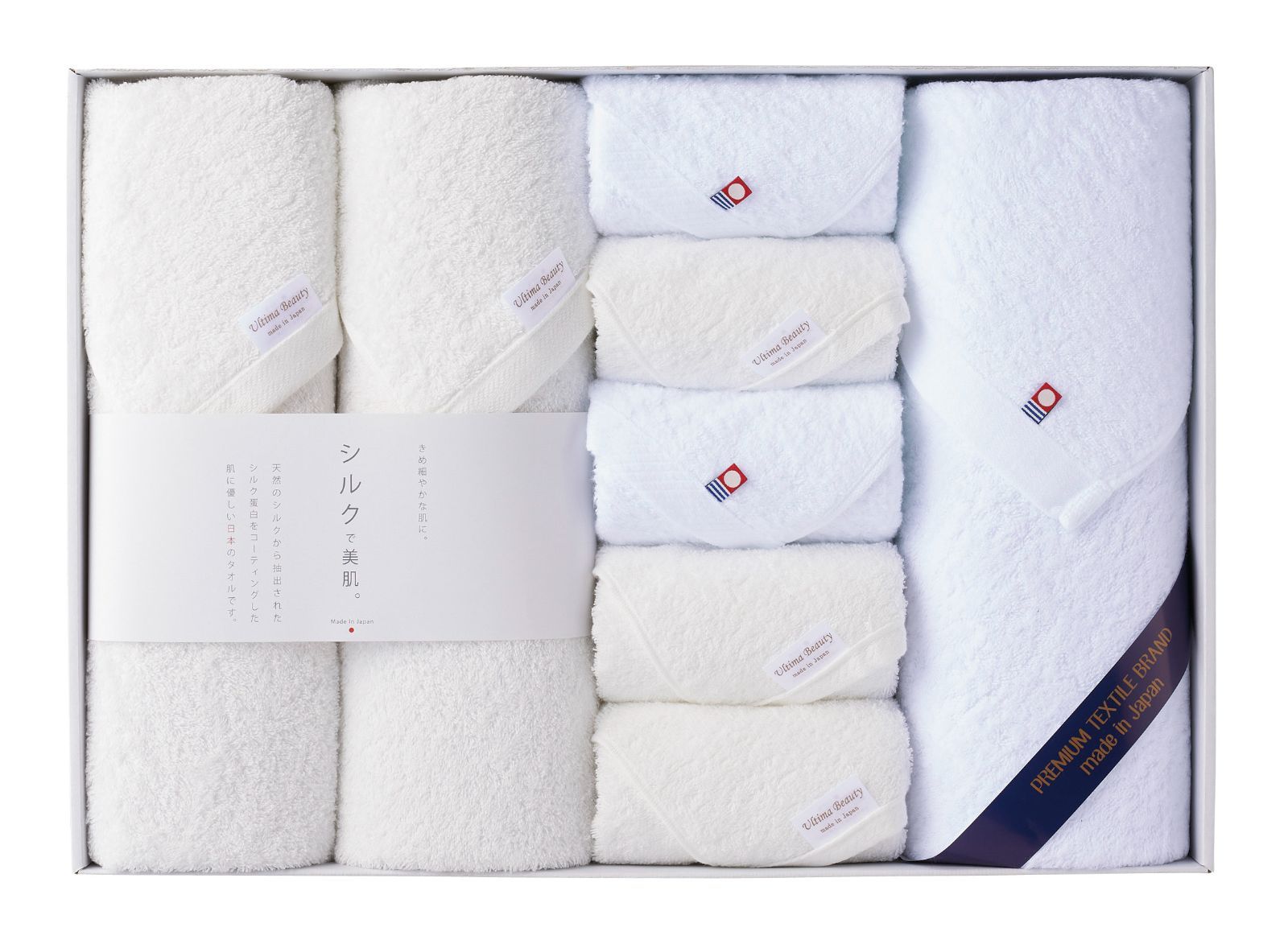 ◆内容/ワイドバスタオル(シルクプロテイン加工):68×130㎝×2・バスタオル(今治起毛加工):60×120㎝×1・フェイスタオル(シルクプロテイン加工):33×80㎝×3・フェイスタオル(今治起毛加工):33×75㎝×2