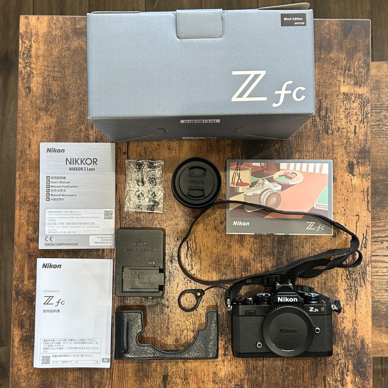 Nikon Z fc ミラーレス一眼カメラ、16-50キットレンズ付き、取扱説明書、ストラップ付き。