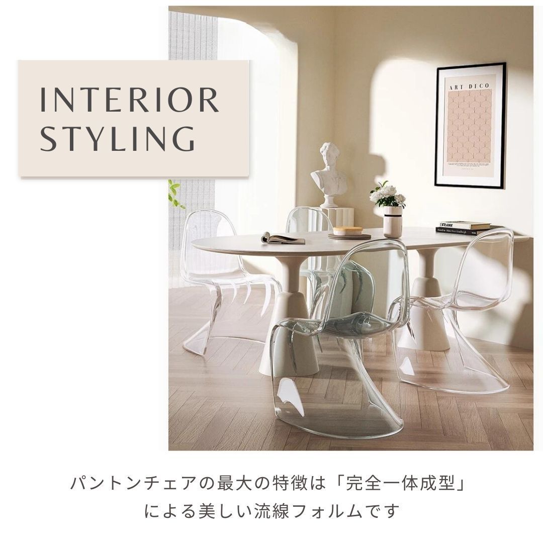 プラスチックの一体成型という画期的なデザインは、お部屋のアクセントとしてはもちろん、座り心地がよく、スタッキングが可能な実用的なチェアでもあります
