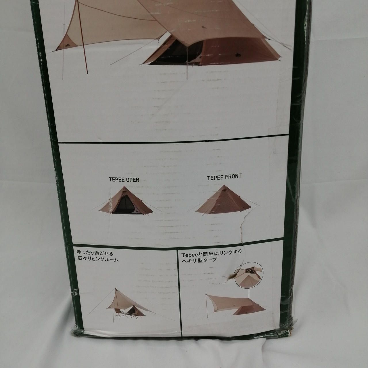 Connectable teepee tent and hexa tarp set! Opened for inspection, but un新品. Box shows signs of sun damage and wear.