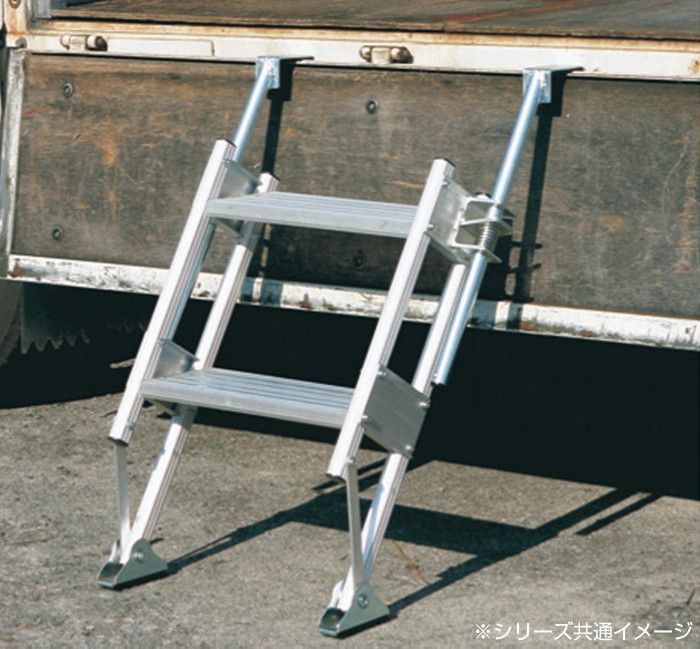 階段の奥行きが広く安心して昇降できます。フック部が伸縮するので、トラックの高さに合わせてセットできます。さらにロック装置付きで階段の位置が安定し、安全です。フックの有効内寸法が7.4cmあり、アオリだけでなく、足場パイプ等にも掛けられます。