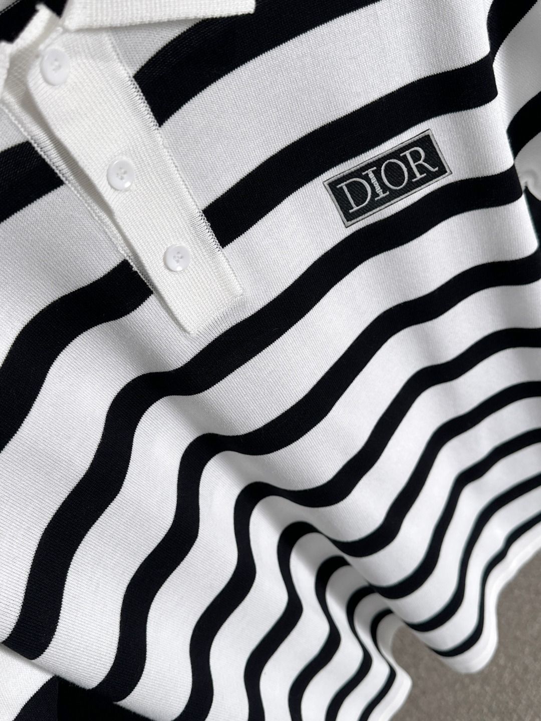 Dior 2025 年春夏コレクションのメンズポロシャツです。精梳コットン糸を使用したニット織りの?績棉布素材で、高グラム重の特殊糸により、手触りで重厚感を感じられ、通常の T シャツよりも着こなしの質感が格段に向上しています。この生地は気候に柔軟に適応し、暑さ寒さ問わず快適に着用できます。