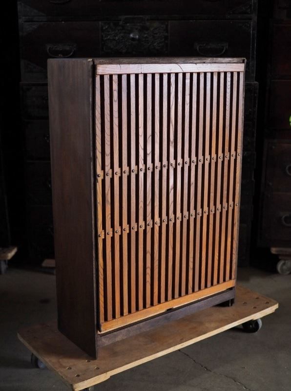 格子リメイクのレトロな飾り棚 昭和前期。裏面に格子建具を貼り付けた和風な棚です。劣化については画像・動画をご確認ください。(◎【注意】① Kサイズ以上の「家財便」は火曜日配送NGです。②離島一部220・Hサイズ以上は配送NGです。)不明点は電話・LINE・メール・Instagramメッセージにてお問い合わせください。誠実にお答えいたします。