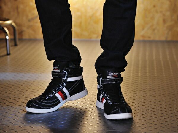 面ファスナーベルト付きで脱ぎ履きしやすいハイカットスニーカータイプのライディングシューズ
