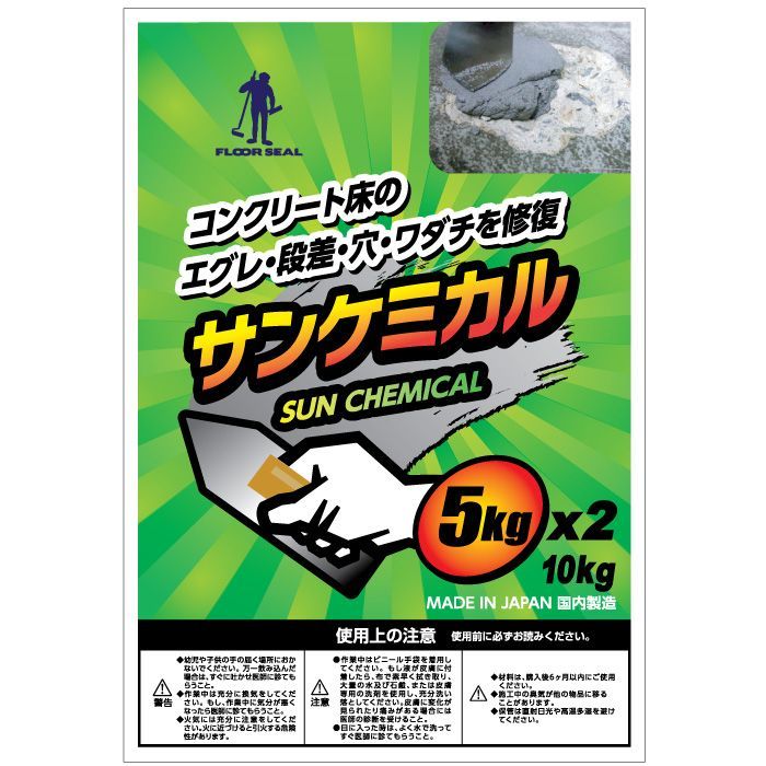サンケミカルは、コンクリート床のエグレ、段差、ワダチ、穴などの補修に最適な二液性エポキシ樹脂です。モルタル補修に代わる画期的な製品で、コンクリートよりも高い強度と接着力を持ち、フォークリフトやプラッター・大型トラックの激しい通行にも耐えられます。施工は簡単で、どなたでも扱いやすいのが特徴です。