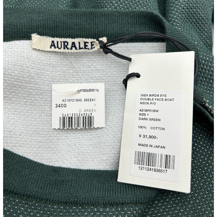 AURALEE オーラリー 七分袖 Tシャツ GIZA BIRDS EYE DOUBLE FACE BOAT NECK トップス レディース バーズアイボートネックニット グリーン W4