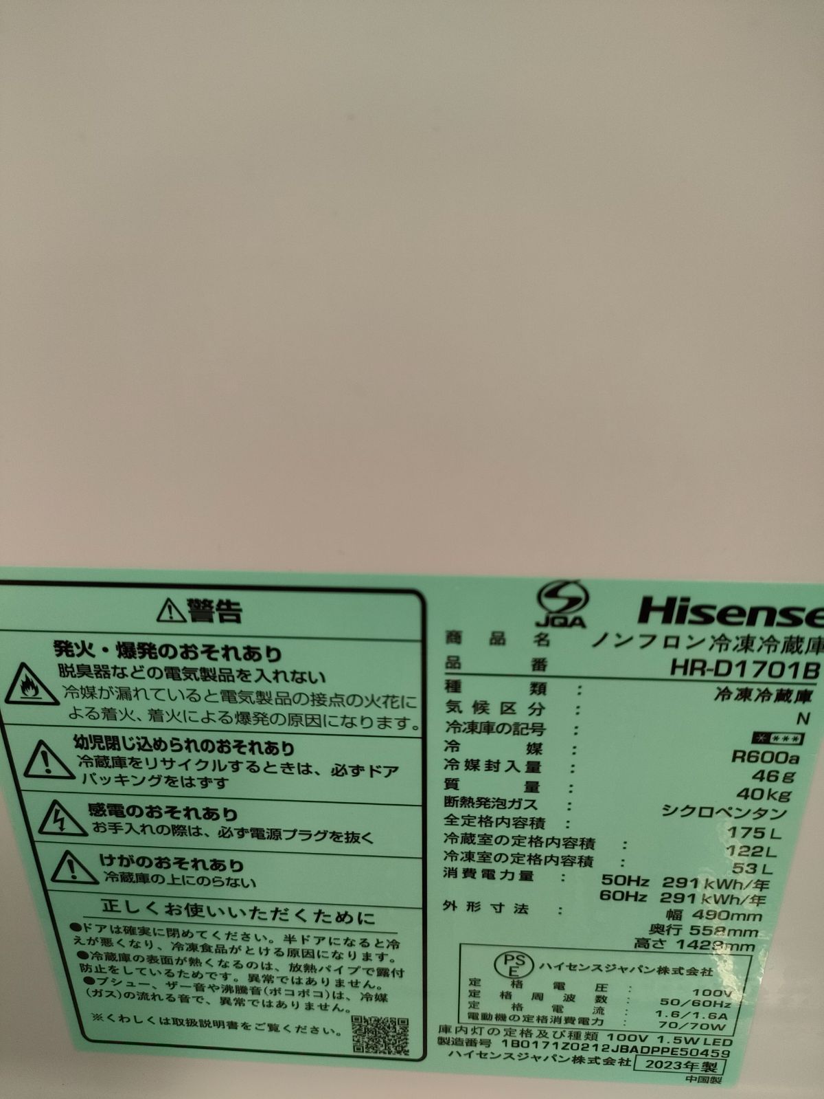 Hisense 冷蔵庫 製 HR-D 1701 B