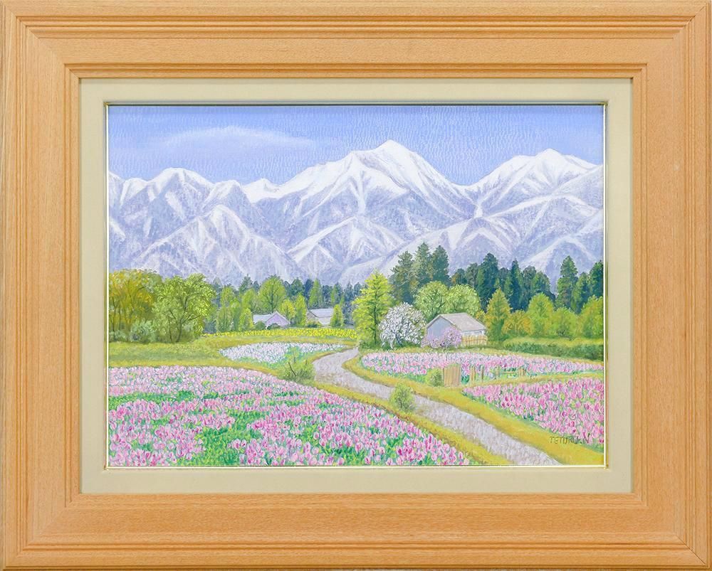 真作 WISH 永田哲郎 安曇野の春 油彩 8号 1995年作 一枚の絵取扱 花野と雪山の春 〇白日会会友 元創元会運営委員