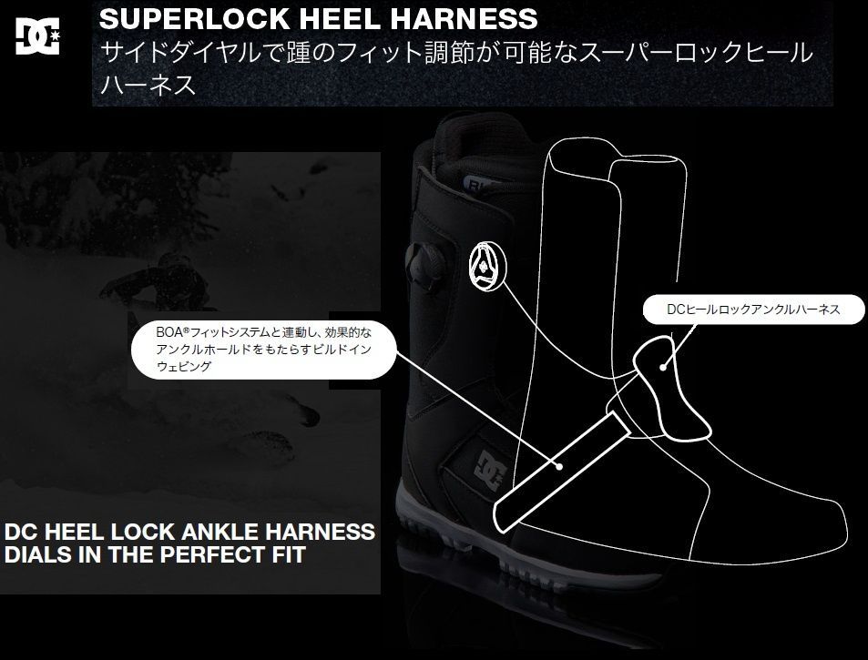 サイドダイヤルで踵のフィット調節が可能なスーパーロックヒールハーネスを採用。