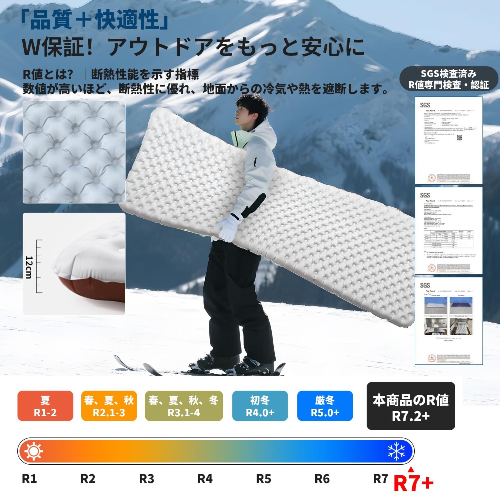 【高断熱性能・R値7.2の安心保温力】?R値7.2以上の高断熱エアマット。?従来のエアマットとは一線を画す7層構造を採用し、内部には3層のアルミフィルムを封入。これにより地面からの冷気をしっかり遮断しつつ、体温を反射して暖かさをキープ。反射効率90%以上の構造で、-25℃の極寒環境でも快適に使用可能です。寒冷地での冬キャンプや雪中泊にも最適な、高レベルの断熱性能を実現しました。