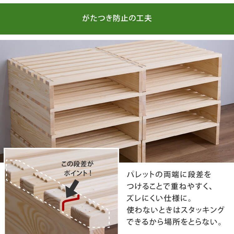 パレットの両端に段差をつけることで、重ねやすくズレにくい仕様です。