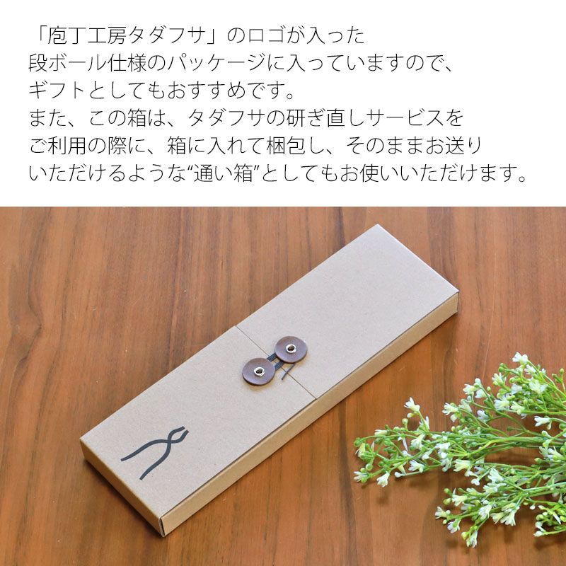 「庖丁工房タダフサ」のロゴが入った段ボール仕様のパッケージに入っていますので、ギフトとしてもおすすめです。