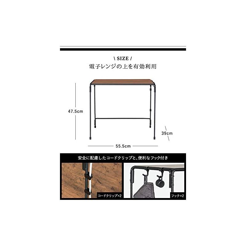 組立式、天板の耐荷重:5kg、フックの耐荷重:0.3kg(1個)、収納可能レンジサイズ:幅約52×高約35cm