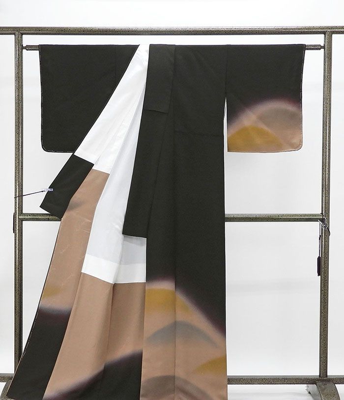 横段幾何地紋の黒紫色地にアーモンドブラウンの濃淡裾ぼかしと芥子やブルーグレー・チャコールで遠山模様が柄付けされています。
