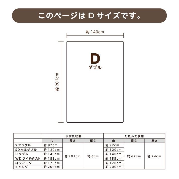 幅140センチ 長さ201センチ 厚さ8センチ