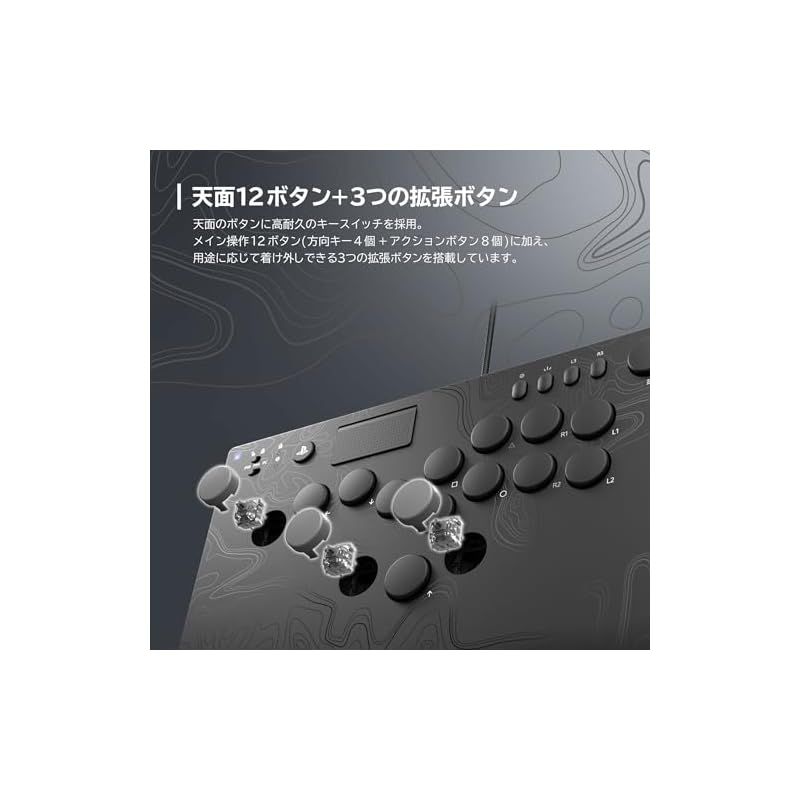最適解へと導く新星。ホリのレバーレスコントローラーがPlayStation®5、Windows PC版で登場。 ■天面12ボタン+3つの拡張ボタン 天面のボタンに高耐久のキースイッチを採用。 メイン操作12ボタン(方向キー4個+アクションボタン8個)に加え、 用途に応じて着け外しできる3つの拡張ボタンを搭載しています。 ■ケーブル着脱機能 / ケーブルロック機能 ケーブルの着け外しができ、コンパクトな持ち運びが可能。 また、ケーブルロック機能によりケーブルの抜けを防止します。 ■アサイン(ボタン割り当て)機能 ボタンの各種機能を自分好みに入れ替えることが可能。 本機能は専用アプリでも設定できます。 ■ステレオヘッドホン / マイク端子搭載 お手持ちのヘッドセットを接続してゲームプレイを楽しむことができます。 ■滑り止めマット 底面に安定性の高い滑り止めラバーマットを採用しています。 ■キーロック機能 キーロック切替スイッチを切り替えることで、オプションボタン、クリエイトボタン、PSボタンの入力を無効にできます。 ■タッチパッド / タッチパッドボタン搭載 DualSense® ワイヤレスコントローラー同様のタッチパッド機能を搭載しています。 ※ PCには対応しておりません。 【製品仕様】 コントローラー ・外形寸法:(幅)約30cm × (奥行)約21cm × (高さ)約3cm ・質量:約710g ・接続方式:USB Type-C™ 接続 ・スイッチ動作点:約1.1mm ・ボタン押下圧:40±10gf ・ボタンストローク長:約2.2mm ・ホットスワップの可否:拡張ボタンのみホットスワップ対応 ・ボタン直径:約23mm(方向キー 上ボタンのみ約26mm) USBケーブル ・ケーブル長:約3m ・接続端子:USB Type-C™ to Type-C™(USB2.0) 【対応機種】 PlayStation®5、PC ※ PCとの互換性は、株式会社ソニー・インタラクティブエンタテインメントによりテスト、およびされていません。 PCでご使用の場合 ・対応OS:Windows 10 / 11 ・入力規格:XInput ※ 本品はXInput対応のゲームのみ対応しています。 DirectInput対応のゲームには対応しておりません。 ・必要環境:USB Type-C™ 端子 【ご注意】 本品はワイヤレスコントローラーではありません。 PlayStation®4でプレイする場合は、弊社製「SPF-015 DualSense® ワイヤレスコントローラー専用 充電USBケーブル」を別途お買い求めください。 ※ PSボタンでPlayStation®5 およびPlayStation®4本体の起動はできません。 ※ PSボタンでPlayStation®5のレストモードおよびPlayStation®4のスタンバイモードからの復帰はできません。 ※ 一部のPlayStation®5およびPlayStation®4規格ソフトウェア(ゲームソフト)ではお使いいただけない場合があります。あらかじめご了承ください。 ※ 本品は以下の機能を搭載しておりません。これらの機能を使用するゲームでは快適にプレイすることができません。 ・ アダプティブトリガー ・ モーションセンサー機能 ・ バイブレーション(振動)機能 ・ 左スティック ・ 右スティック ・ マイク ・ スピーカー ・ ライトバー ・ プレーヤーランプ ・ L2 / R2アナログ入力 【内容品】 ・コントローラー × 1 ・USBケーブル(Type-C™ to Type-C™) × 1 ・取扱説明書 × 1 ・ボタン取り外し用ピン × 1 ※ 「ボタン取り外し用ピン」は製品背面に装着されています。 ・スイッチ(予備) × 1 ・ボタン穴用キャップ × 3 【ご注意・その他】 本品は、アメリカ合衆国またはその領土での販売が認可されていません。 This product is not authorized for sale in the United States of America or its territories. 写真と本品は多少異なる場合があります。 本品の仕様および外観は改良のため予告なく変更することがありますのでご了承ください。 記載されている機能以外は搭載しておりません。 内容品に記載されているもの以外は含まれておりません。 その他のすべての商標に関する権利は、それぞれの権利所有者に帰属します。 株式会社ソニー·インタラクティブエンタテインメントまたはその関連会社からのライセンスに基づいて製造および販売されています。 USB Type-CはUSB Implementers Forumの商標です。 © HORI CO., LTD. ※本品は日本国内のみの販売としております。 This product is not authorized for sale in the United States of America or its territories.