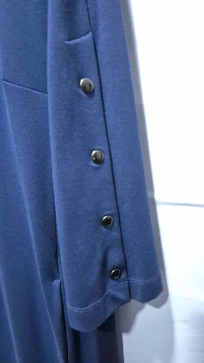 オイルリリーのロングドレスです。ネイビーカラーで落ち着いた感じがします。袖にはボタンディテールがあってアクセントになっています。