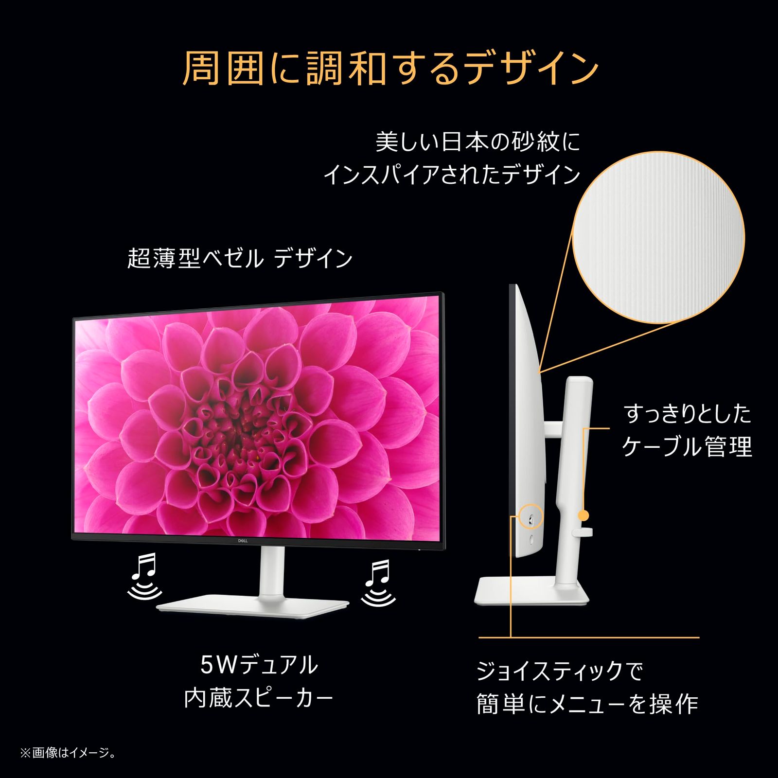 プロファイル搭載:標準、映画、ゲーム、音楽、音声、カスタマイズ可能プロファイル(1種類)【ライフスタイルを重視したデザイン】背面は美しい日本の砂紋にインスパイアされたテキスチャーを採用し、周囲に調和するデザインを実現。また、ケーブルをまとめてすっきり管理ができるスロット搭載のスタンドは、モニターの傾き調整、左右角度調整、縦横回転、高さ調整が可能なので、あらゆる場所であらゆる作業に対応できます。【スタイリッシュにセットアップ】<簡単に接続>ケーブルをより管理しやすくなり、すっきりしたデザインになりました。さらに、プライマリ接続ポートと、アクセスしやすい側面のセカンダリ接続ポートを備え、マルチデバイスのセットアップで複数の入力が可能です。<ゲームもコンテンツ視聴も快適>デュアルHDMI接続ポートを内蔵し、ストリーミングとカジュアルなゲーミングをシームレスに切り替えることができます。【Dell