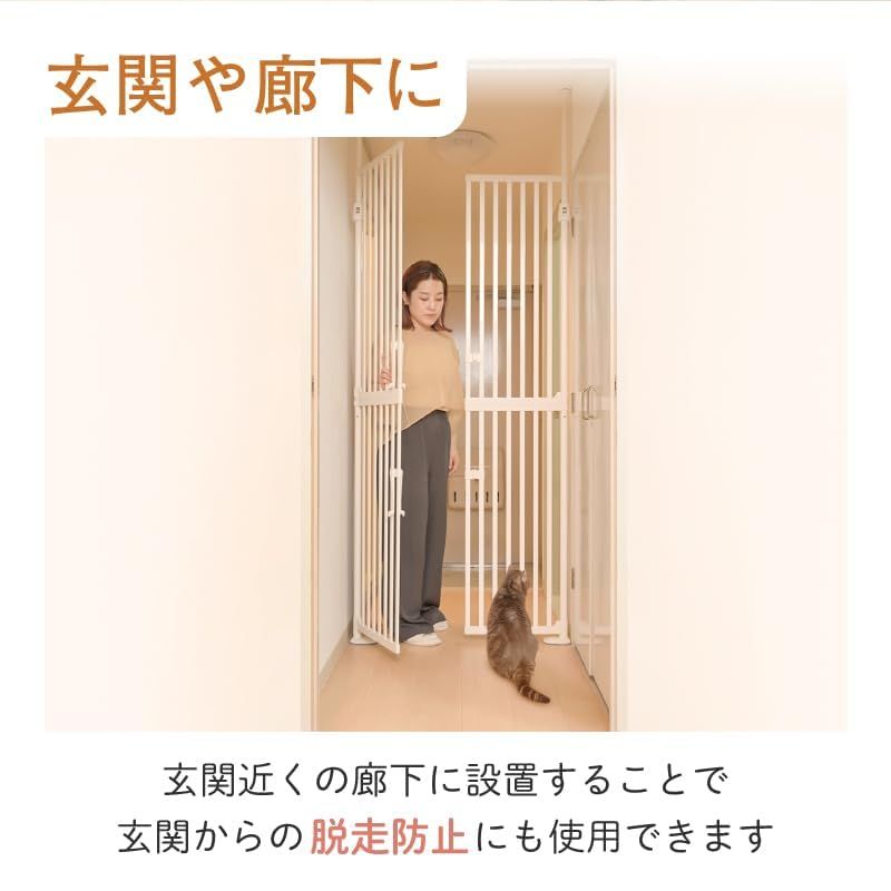 【超ハイタイプ&多用途設計】猫の脱走を防ぐ安心のペットゲート 室内飼いの猫にとって、脱走やいたずらは心配の種。そんなお悩みを解決するのが、この高さ190cmの超ハイタイプ猫用ゲートです。驚異的なジャンプ力を持つ猫でも飛び越えられず、格子幅も3.4cmと細かいため、子猫のすり抜けも防止。設置も簡単で、賃貸住宅にも最適です。 製品特長 【猫のジャンプも防ぐ超ハイタイプ設計】 高さ190cmで飛び越え防止。格子幅3.4cmで、子猫のすり抜けもシャットアウト。 【安心のダブルロック機構】 上下に可動式のロックを搭載。ハンドルロックとスライドロックの二重構造で、猫が自力で開けることは困難です。 【工具不要&簡単設置】 軽量アルミ素材を採用し、女性ひとりでもスムーズに設置可能。突っ張り式で、床や天井を傷つけず、賃貸物件でも安心です。 【多用途に対応するスマート設計】 幅85?93cmに対応(拡張フレーム使用で最大123cmまで)。玄関、キッチン、ベランダ前など、さまざまな場所に設置可能。両開き扉&バリアフリー構造で、人の出入りもスムーズです。 設置場所の例 玄関前/キッチン前/ベランダ出入口/階段前 など 猫の行動範囲を安心・安全にコントロールできます。