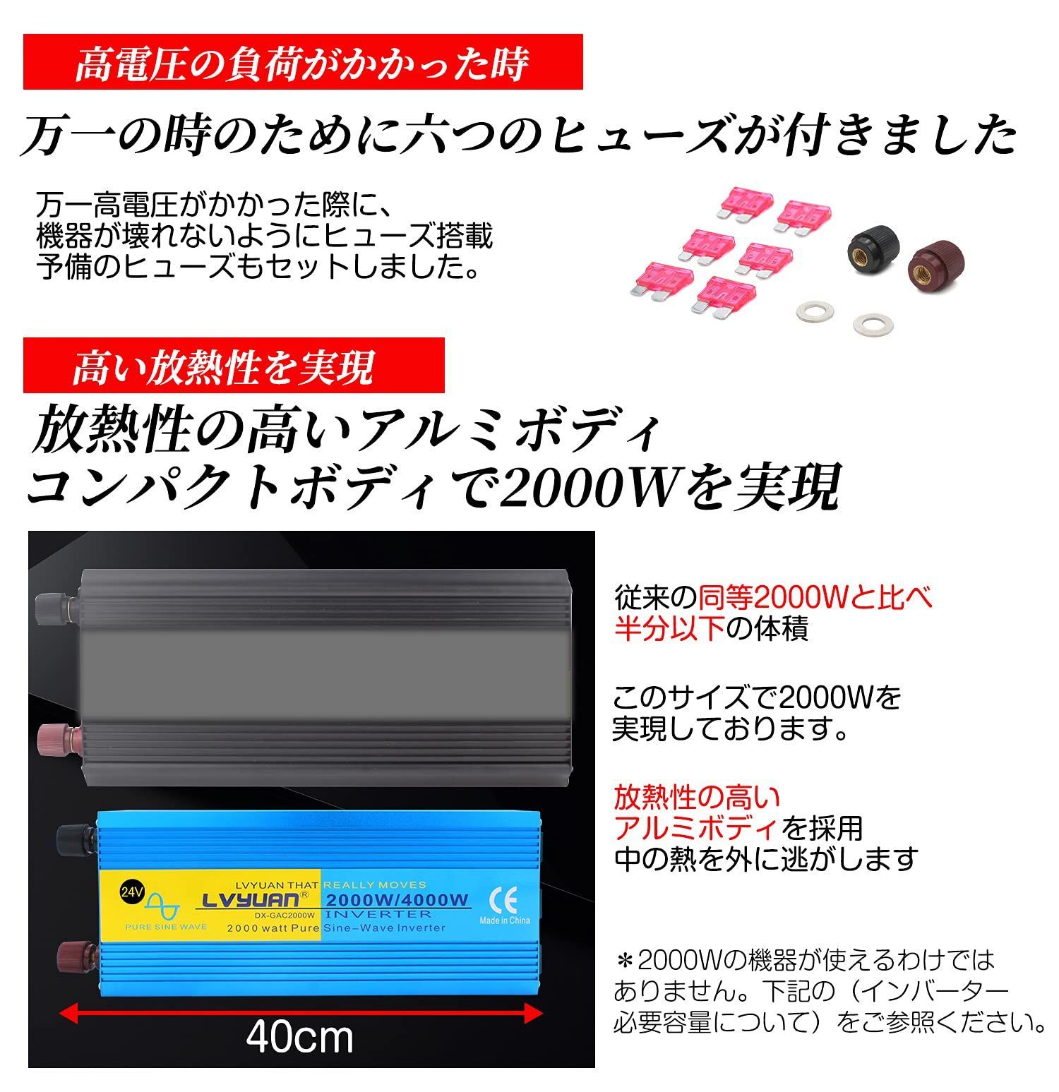 ※仕様 定格出力:2000W 入力電圧:DC24V(19.5-24V) 出力電圧:100V±5V 出力周波数 : 50Hz・60Hz ひずみ率:<3% 効率:>88% 電圧計 :入力電圧、出力電圧 低バッテリアラーム:DC19V±0.5V 低バッテリシャットダウン:DC 18.5V±0.5V 高バッテリシャットダウン:DC 30V 稼働温度:045℃ 高温保護>75℃ 商品重量 :2.9kg 製品サイズ :400mm*150mm*85mm 無負荷電流:1.6A※附属品: 2x 25Sqバッテリー接続クリップ 6×ヒューズ 日本語取扱説明書