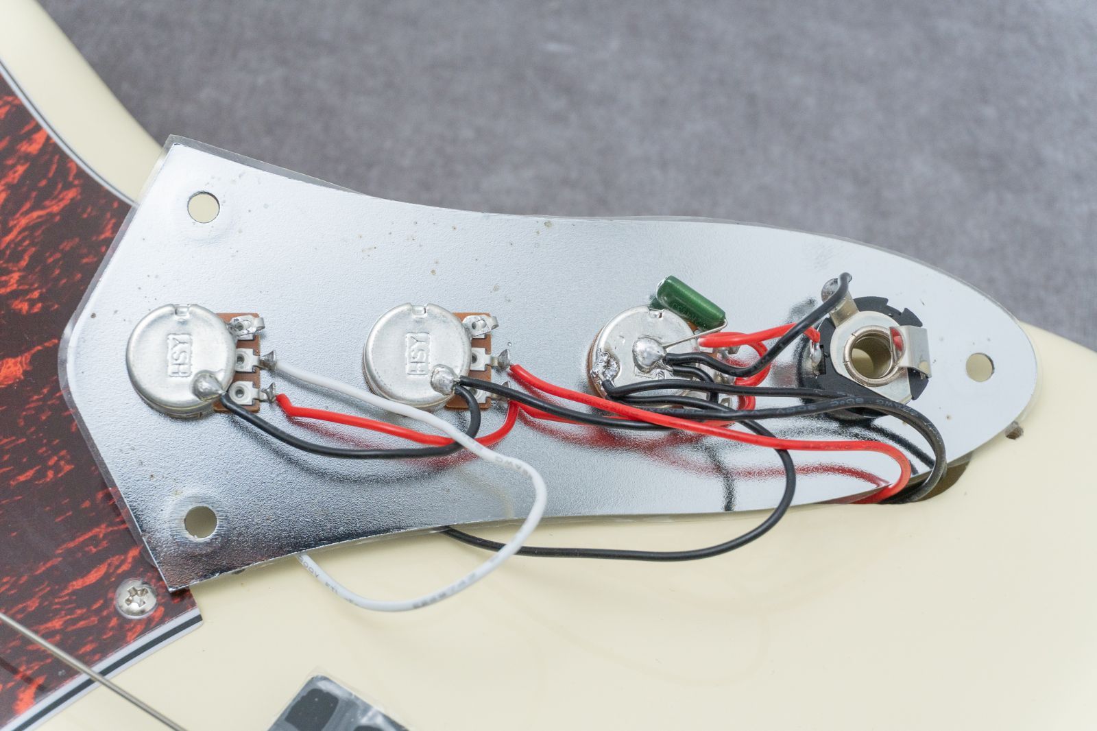 GIB mod.ではジャックとワイヤーを、Fenderなどの一流ブランドでも使われる、いわば世界的にスタンダードなものに交換いたします。