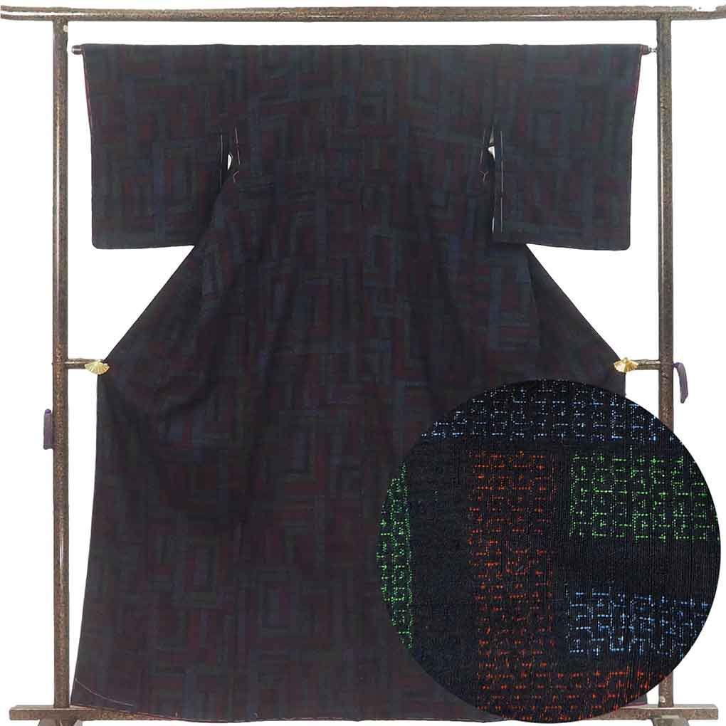 正絹の重要無形文化財「結」マークの結城紬着物です(証紙付)。濃い紺地に八十亀甲の先染絣でカジュアル用途にお召しいただけます。身長158cm-168cm程度、標準体型の方にお勧めサイズです。広衿仕立。八十亀甲の絣は大きめではありますが、結城紬のファンは太めの糸を使って比較的生地が厚くて暖かい八十亀甲を好む方も多いです。裄の縫い代は4cm程度ありそうです。