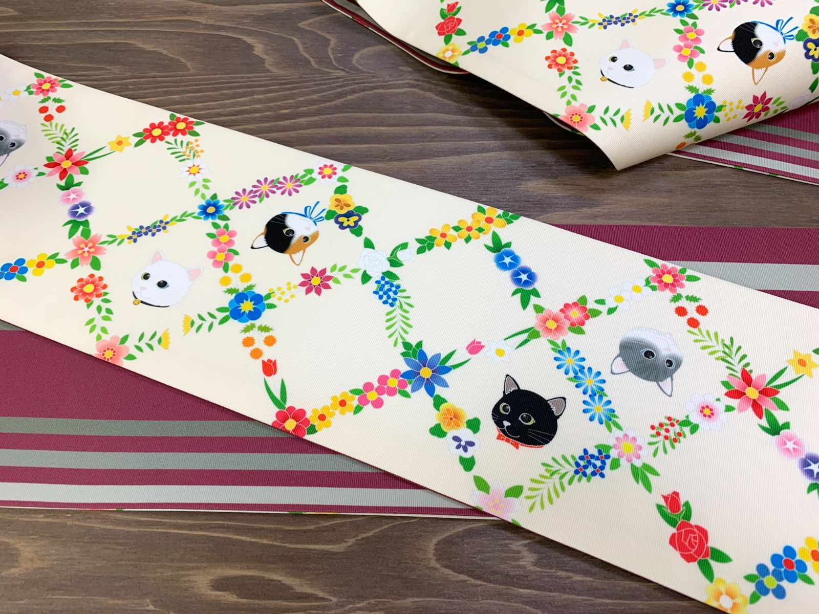 こちらの「花格子にねこ2」は、華やかな花格子とねこちゃんを組み合わせた半幅帯です。色無地や小紋の着物や浴衣にもピッタリ合わせやすく、華やかにコーディネートしてくれます。帯は両面お使いいただけます。お着物や、その日の気分に合わせて2通りの組み合わせをお楽しみいただけます。長さは約430㎝と嬉しい長尺サイズです。