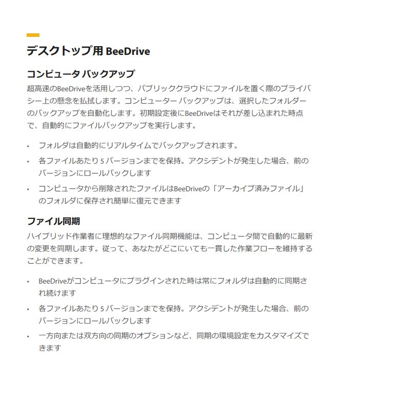 • 誤って削除した場合でも、ファイルはBeeDrive内の「アーカイブ済みファイル」フォルダに保存されているため、簡単に復元可能です。