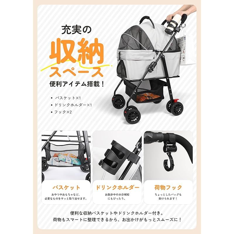 【ワンタッチ折り畳み&大容量収納】詳細な組立説明書が付属しており、簡単に設置できます。ワンタッチでコンパクトに折りたためます。ドッグカート下部に大型収納バスケットに加え、カップホルダー1個とフック2個を無料付属!ペット用品からお出かけグッズまで、たっぷり収納でお出かけ楽々!