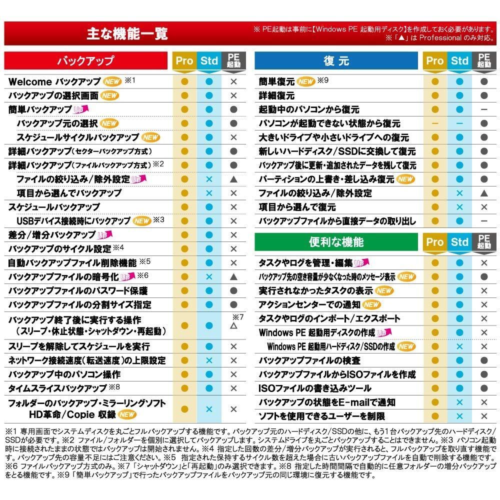 パソコン初心者から上級者の方まで、簡単操作・多彩な機能でパソコンのデータをバックアップ/復元できるバックアップソフトです。パソコン使用時の不測のトラブルの備えとしておすすめです。「Ver.5」では、初心者の方でも迷わないようにWelcomeバックアップ画面を搭載。他にも簡単バックアップのサイクルスケジュール機能やUSBデバイス接続時に自動バックアップを行う機能などを追加。また既存機能の仕様の見直しによる安定化、使いやすさの向上などを行い、前作よりも、更に使いやすくなりました。プロフェッショナル版はVer.5すべての機能が搭載されており、コピー&ペースト方式のフォルダー間のバックアップ/ミラーリングが出来る「HD革命/Copie」を収録しております。3台用はシリアル番号カードが3枚同梱しております。個人/法人のお客様がご購入出来ます。