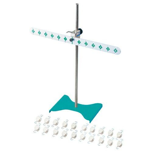 ●サイズ/うで:30×400mm、12等分(穴の間隔30mm)、金属製支柱:φ12×440mm(有効長)、鉄製台座:180×140×15mm●重量/約475g●錘吊り下げ穴:三角形●付属品/力学実験用樹脂おもり(10g)20個