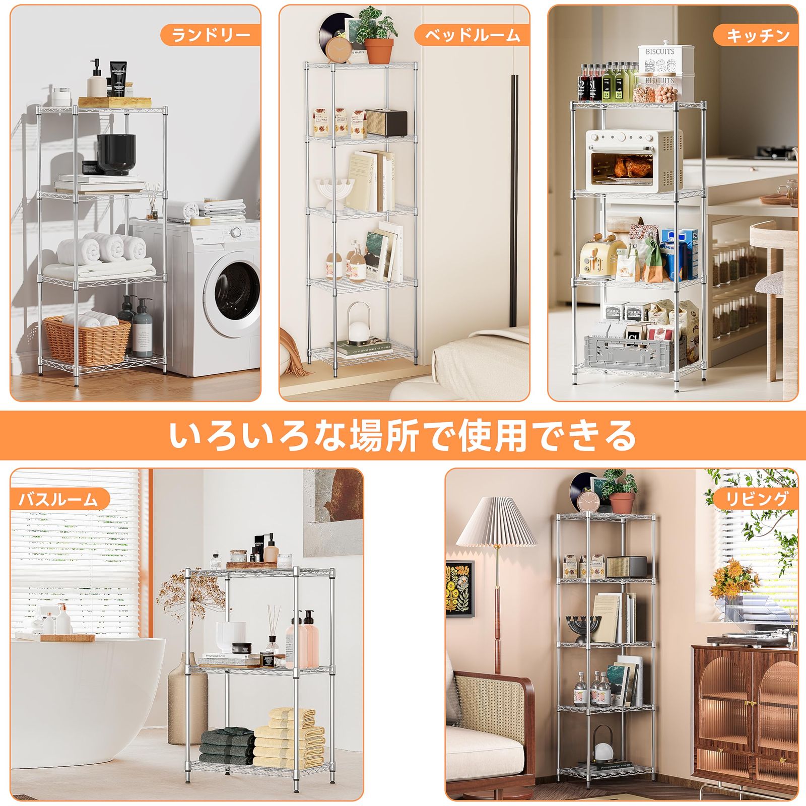 頑丈な金属素材とアジャスター付き:この収納ラックは頑丈で耐久性のある高品質のスチールで作られており、炭素鋼素材の表面はコーティングで覆い、縁も滑らかで、収納棚はサビとキズを防ぐことができます。このスチールラックは底部には円形のアジャスターが取り付けられており、棚の転倒を効果的に防止し、床も傷つきにくいです。凹凸のある地面に対応するために調整可能な脚。家の使用環境に応じて適切な高さを選択できます。