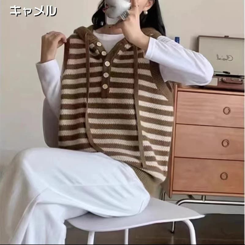 ニットベスト フード付き 即 OK ボーダー レディース レイヤード 重ね着 ゆったり ニット 春 秋 トップス ベスト ノースリーブ シンプル カジュアル きれいめ お洒落 着回し 仕事 オフィス 通学 通勤 huanyi 45
