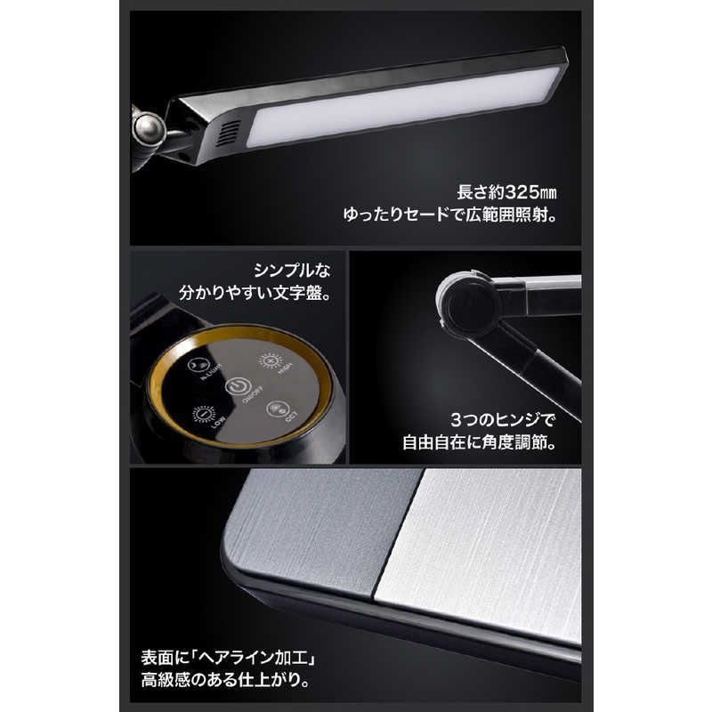 デザインは深みのあるアンティークシルバーに、ヘアライン加工を施し高級感のある仕上がりにサイズ:約H505×W159×D220mm重さ:本体/約1.4kg電源:AC100V 50Hz / 60Hz出力:USB 5V/1.0A光源:LED(10段階/無段階調光)光色:約3,000~6,500K(3段階)明るさ:最大約550lm消費電力:最大約10W充電コード:約1.2m素材:ABS+鉄