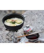 ヤエンクッカーは、今まで深型クッカーでしかできなかった調理器具のスタッキングを、浅型クッカーでも実現。アルミ素材にフッ素加工を施したクッカーとフライパンのコンビで、様々な調理を一台でこなす、実用的クッカーです。